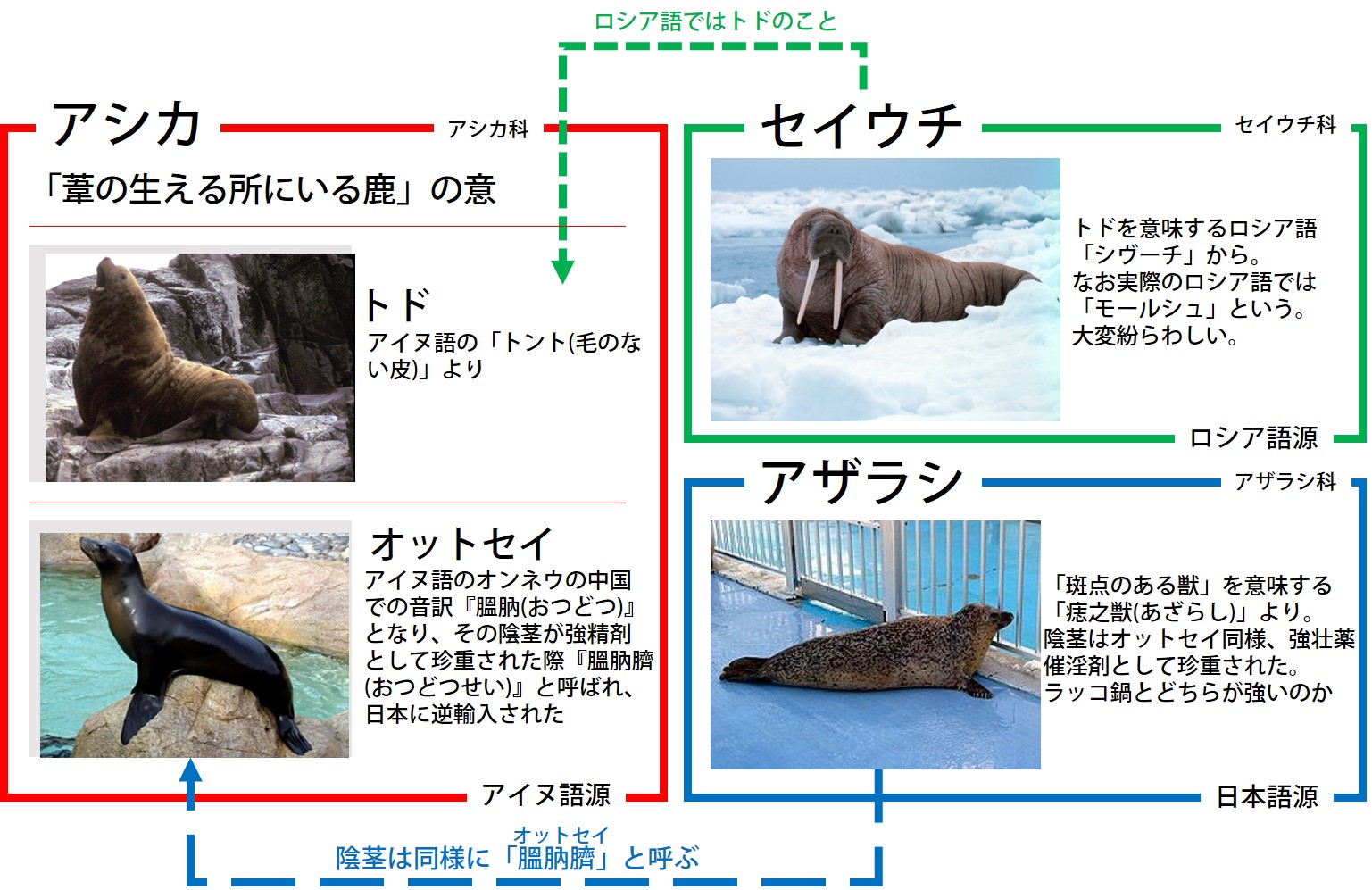 三崎律日 奇書の世界史 発売中 On Twitter アシカ トド オットセイ セイウチ アザラシ の語源が錯綜しすぎて意味がわからなかったので纏めた アザラシのちんこをオットセイと呼ぶ とか何言ってんだお前状態