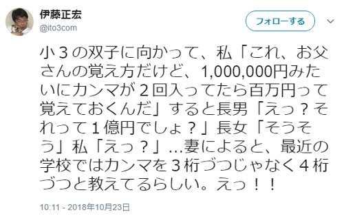 最近の小学校は数字のカンマを3桁ではなく4桁ごとに区切って教えてた ニコニコニュース